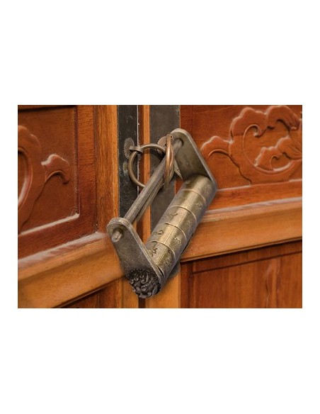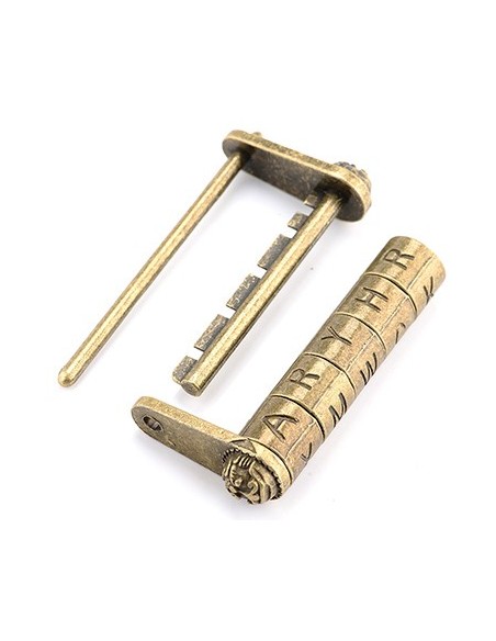 Cadenas à combinaison original à 5 lettres, fabrication traditionnelle en alliage de zinc effet bronze antique. Quand vous avez la bonne combinaison, vous pouvez faire coulissser et ouvrir le cadenas. Idéal pour fermer une porte de placard par exemple.